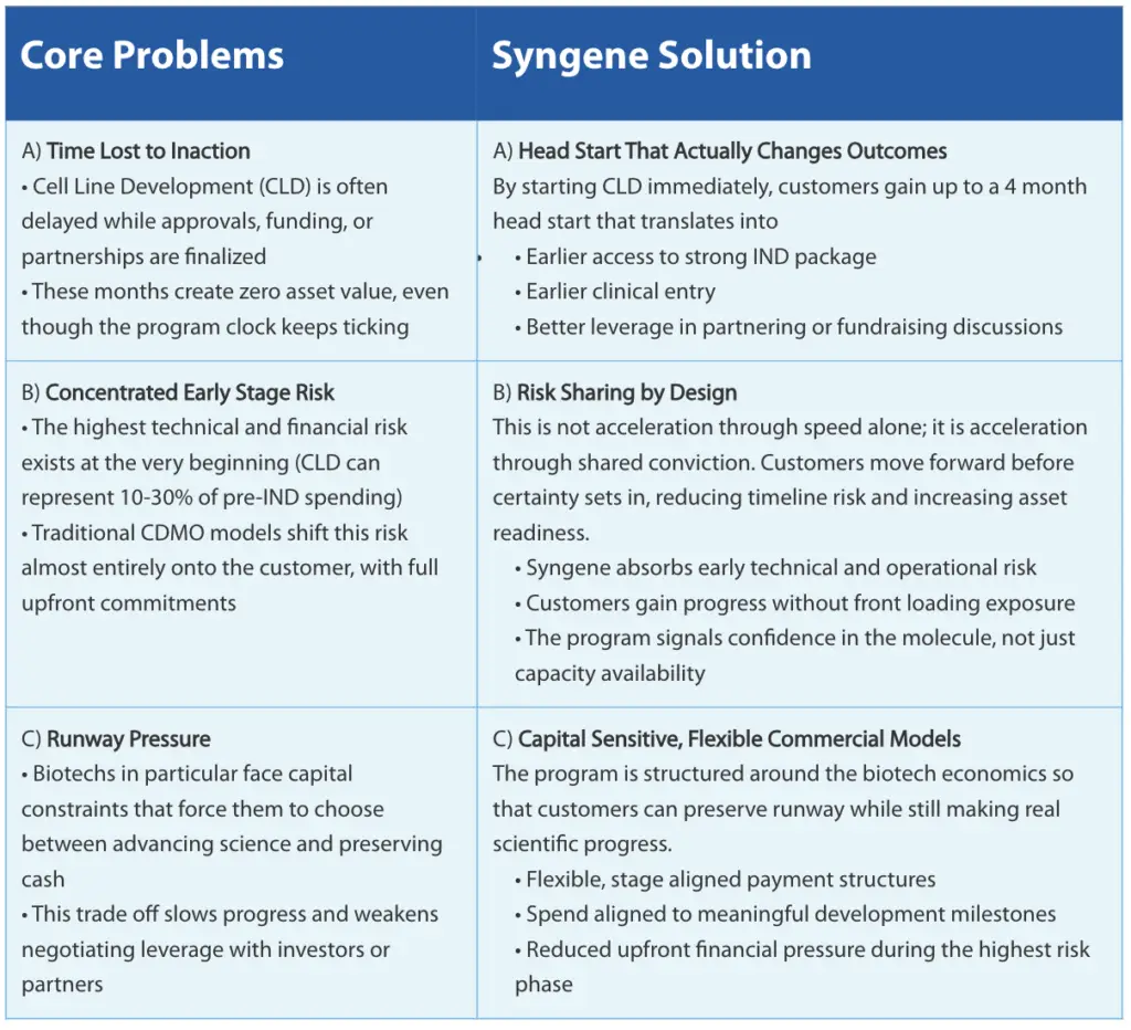 Syngene commits capacity, resources, and scientific expertise upfront, sharing early technical and operational risk alongside the customer.