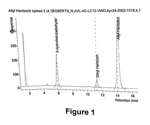 A sample of Allyl Hantzsch containing 10%w/w of 3-cyanobenzaldehyde was prepared. The sample was diluted in d6-DMSO. An aliquot of the above sample was further diluted with HPLC eluent and a chromatogram was obtained (refer Fig 1). A second aliquot was taken and further diluted with d6-DMSO, and a quantitative 1H NMR spectrum was obtained (refer Fig 2). This was performed in duplicate.