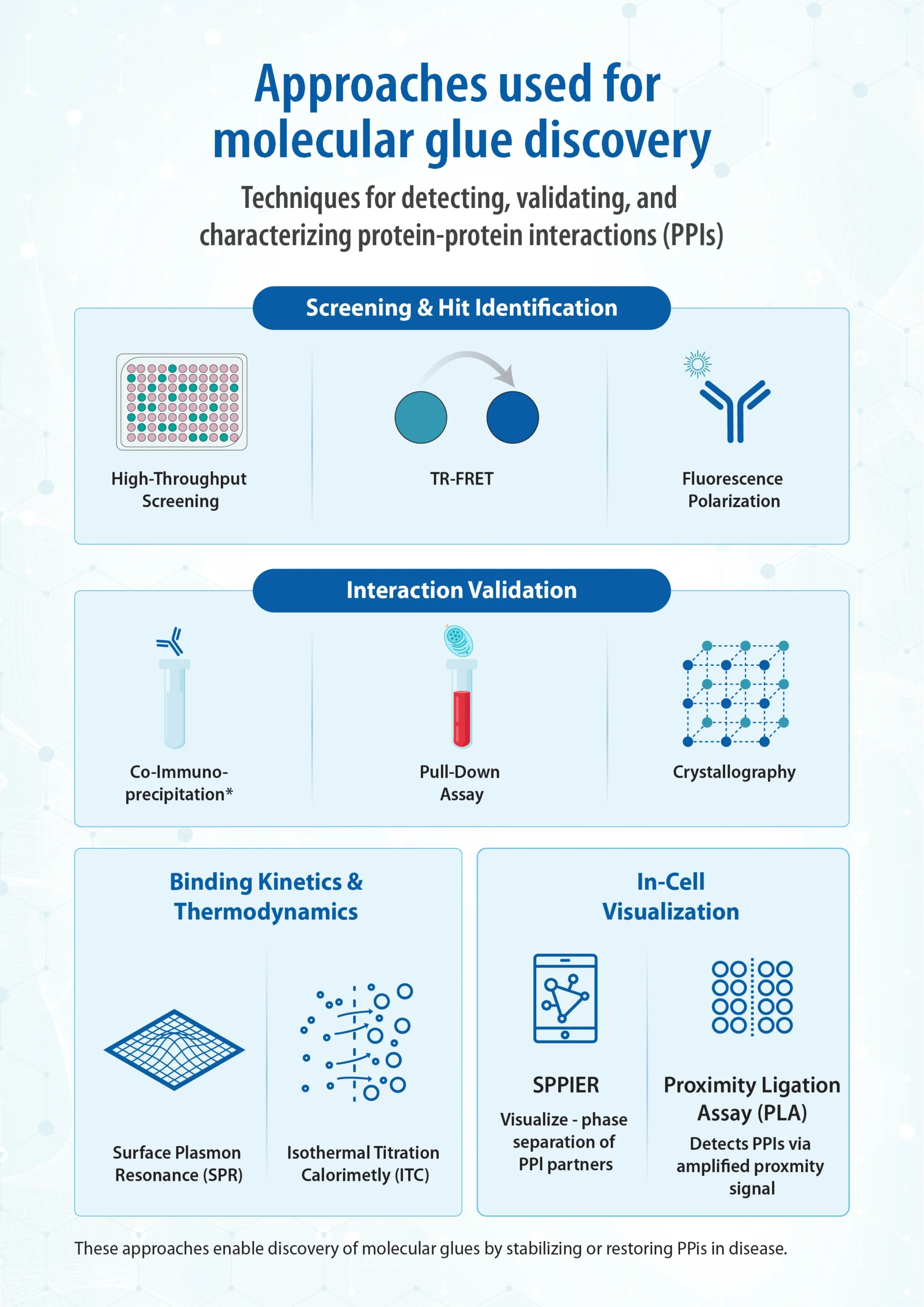 Molecular glues represent a versatile and powerful modality in modern drug discovery, extending the reach of small molecules into complex protein networks by harnessing induced proximity. Success depends on clear, orthogonal evidence: rapid screening to find signal, biophysics to anchor thermodynamics and cooperativity, structural snapshots to rationalize binding, and cellular confirmation to ensure biological relevance. As case studies continue to grow, disciplined, mechanism-led workflows will help in prioritizing, optimizing, and translating molecular glues into impactful therapies. We recommend routine isothermal titration calorimetry checks alongside fluorescence polarization and co-immunoprecipitation to align mechanism with potency.