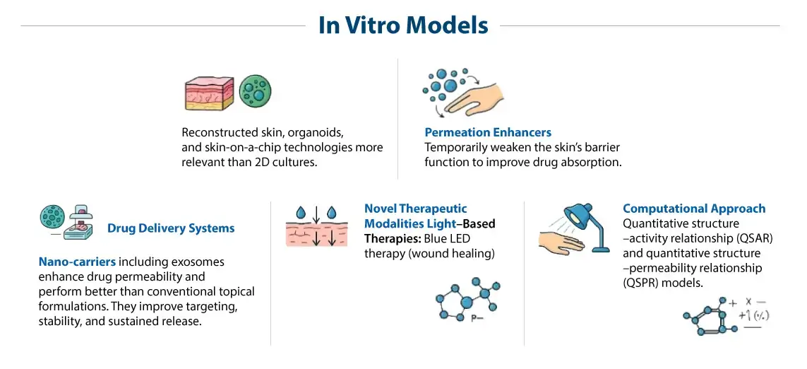 Modern dermal delivery uses a stepwise set of tools that link discovery to the clinic. At the earliest stage, in silico models and high-throughput assays such as skin PAMPA enable rapid ranking of analogues based on their ability to cross a synthetic lipid layer that mimics the stratum corneum. These models are useful for identifying trends but do not capture the complexity of real human skin.
