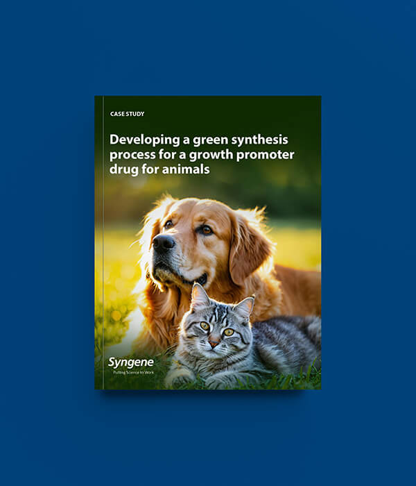 An animal health company commissioned Syngene to develop an environmentally friendly synthesis process for a growth promoter drug in phase 1 clinical trials that could drastically reduce the cumulated environmental factor (cE-factor) and process mass intensity (PMI) values compared to the traditional workflow.