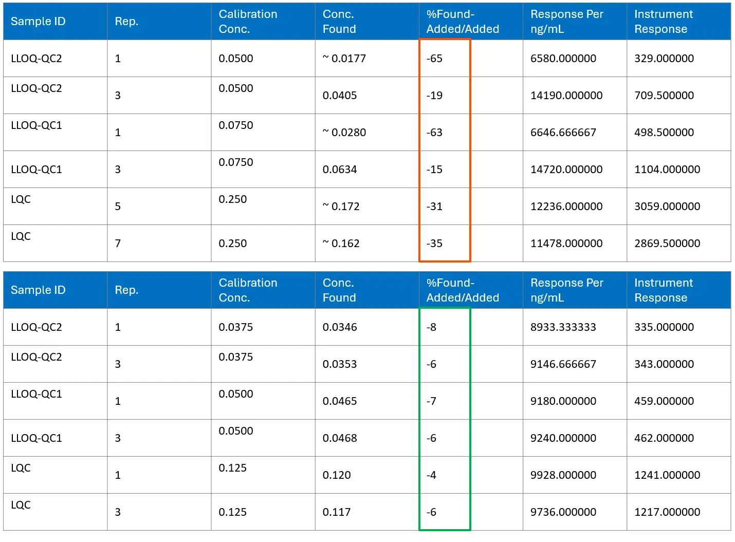 With these changes, spike-recovery bias improved from a wide range of –15% to –65% to a narrow band around –4% to –8%, appropriate for a fit-for-purpose PK assay.