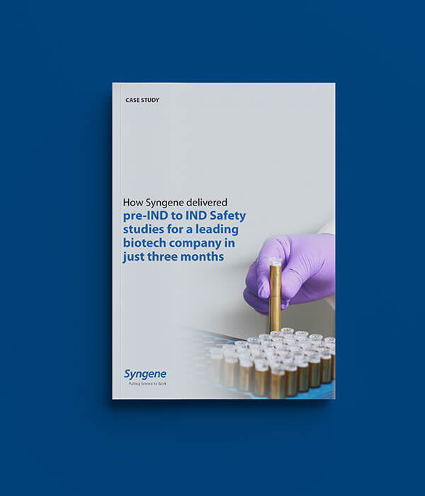 Starting an investigational new drug (IND) program during a pandemic presented multiple hurdles. Not at the very least was ensuring an uninterrupted supply of animals, raw materials, and operations necessary to meet stringent regulatory timelines. However, Syngene’s robust business continuity plan convinced the company that their project would be in safe hands, and the contract for IND-enabling studies with signed with us.