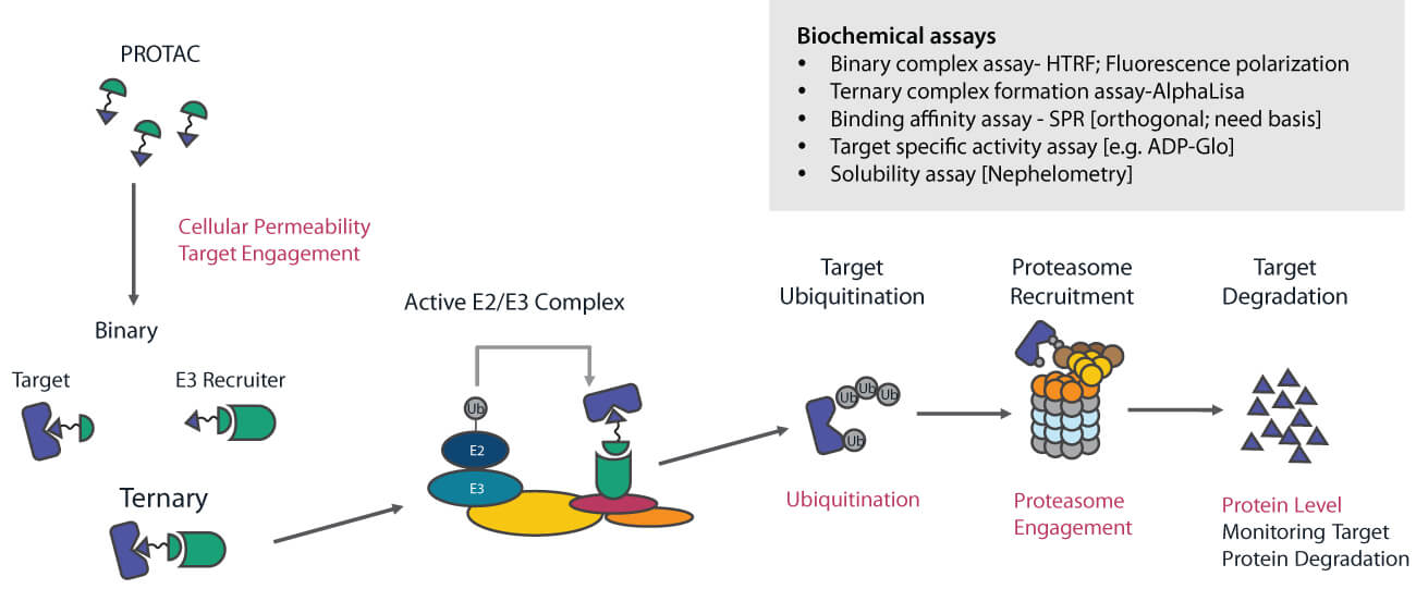 Despite rapid progress, PROTAC discovery remains challenging and laborious, and largely defined by an empirical process. Hence, it is important to have a set of techniques and assays that can characterize and rank such heterobifunctional compounds rapidly and efficiently for different properties and provide valuable feedback to guide medicinal chemists during the lead discovery and lead optimization process. The compound profiling for PROTACs involves a step-wise approach engaging the ubiquitin-proteasome degradation pathway using biochemical, biophysical, and cellular assays. This is to ensure that the molecules are not only penetrating the cells but also forming a ternary complex amongst POI, PROTAC, and E3 Ligase followed by target ubiquitination degradation (Figure 4).