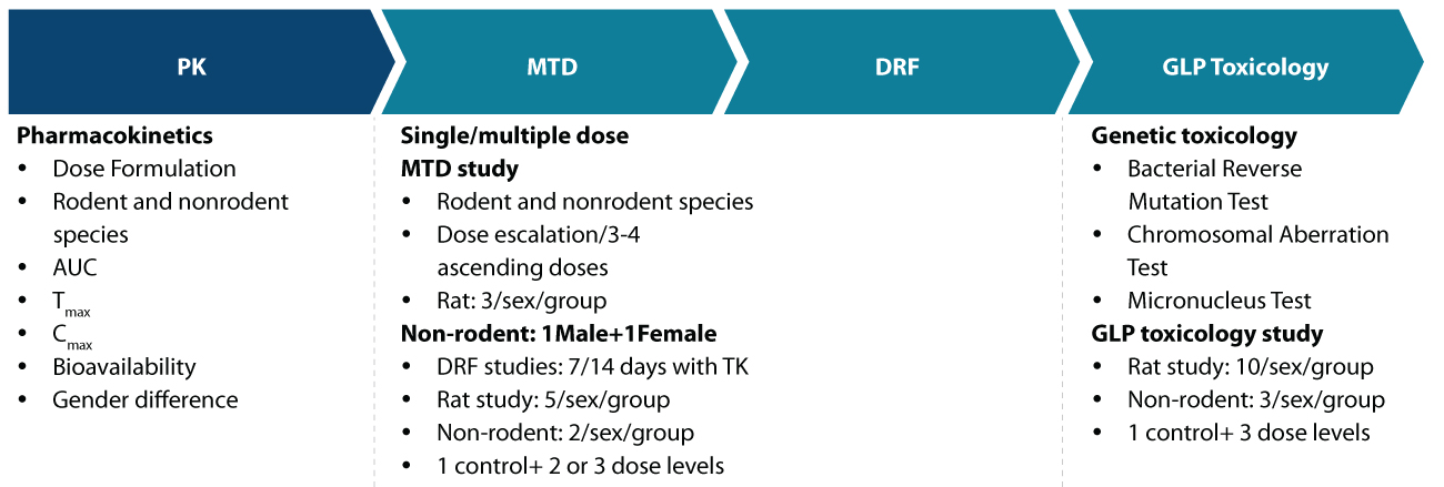 • Maximum tolerated dose (MTD) studies and dose range-finding (DRF) studies across rodent and non-rodent species