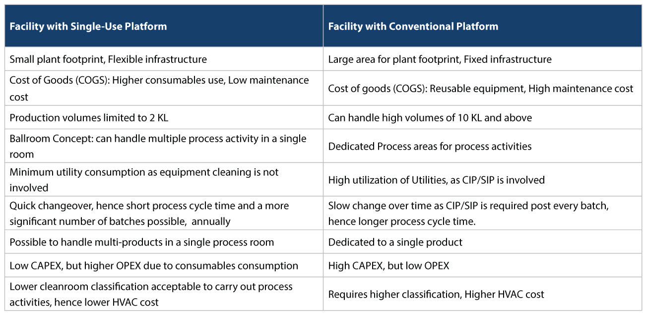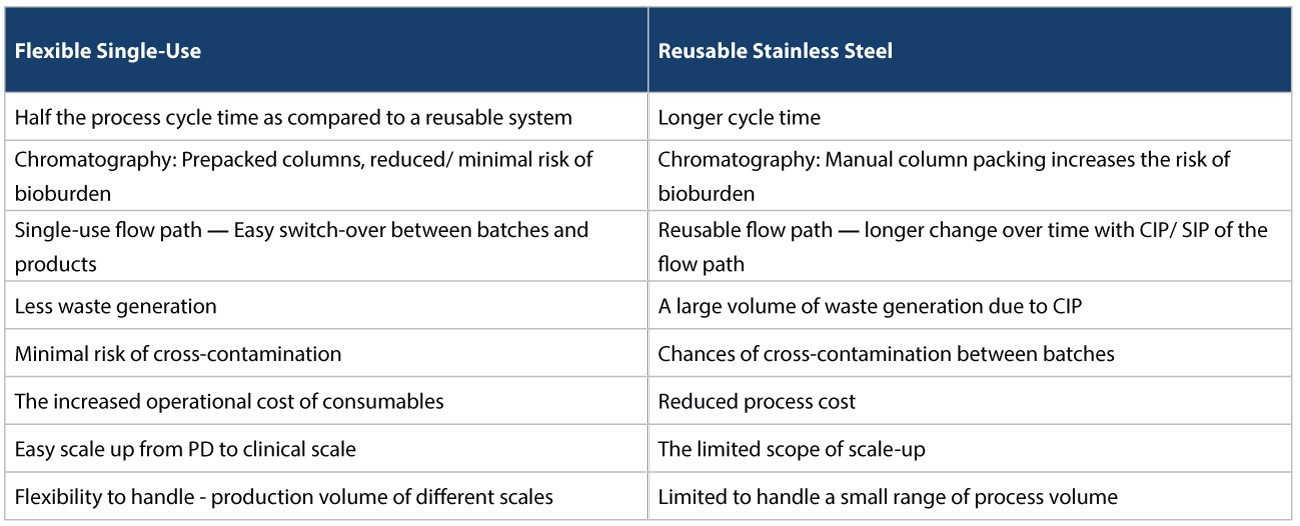 Easing capacity constraints In such a scenario, using CMOs/CDMOs to take on vaccine manufacturing provides significant risk mitigation. For starters, they could ease capacity constraints, and help in responding more quickly to changes in demand. For example, today, various vaccine approaches being taken to address COVID-19, rely on r-proteins, viral vectors, or mRNA. Many CDMOs already have the expertise in this area to produce firstgeneration vaccines, at speed. Accelerating regulatory approvals Vaccine manufacturers can also accelerate regulatory approvals if regulators have previously authorized similar products before. For example, several platform technologies being used to produce COVID-19 candidate vaccines are relatively untested. The resulting vaccines’ modular nature could mean, that regulatory approval can be expedited, as these technologies become more common place. Flexible Facilities Most CMOs/CDMOs also use flexible facilities with single-use disposables for manufacturing, which has several advantages. This is as opposed to reusable systems used by traditional Biopharma companies who usually have conventional facilities. The conventional facilities use stainless steel for upstream and downstream activities which have several disadvantages that need to be addressed (Refer Tables 1, 2, and 3 below).
