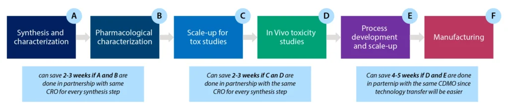 The Syngene peptide team has a wealth of experience synthesizing complex peptides. Our Center of Excellence for peptides offers end-to-end services ranging from Discovery to Development and cGMP Manufacturing. The figure below shows the time efficiencies that biopharma companies can gain by partnering with CROs/CDMOs like Syngene having an integrated workflow.