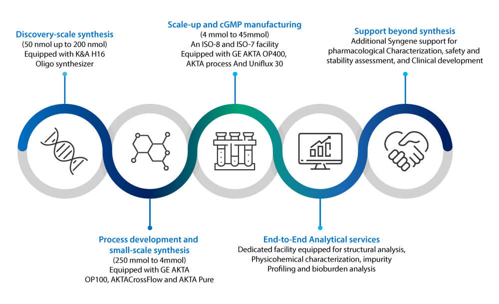 The Syngene peptide team has a wealth of experience synthesizing complex peptides. Our Center of Excellence for peptides offers end-to-end services ranging from Discovery to Development and cGMP Manufacturing. The figure below shows the time efficiencies that biopharma companies can gain by partnering with CROs/CDMOs like Syngene having an integrated workflow.